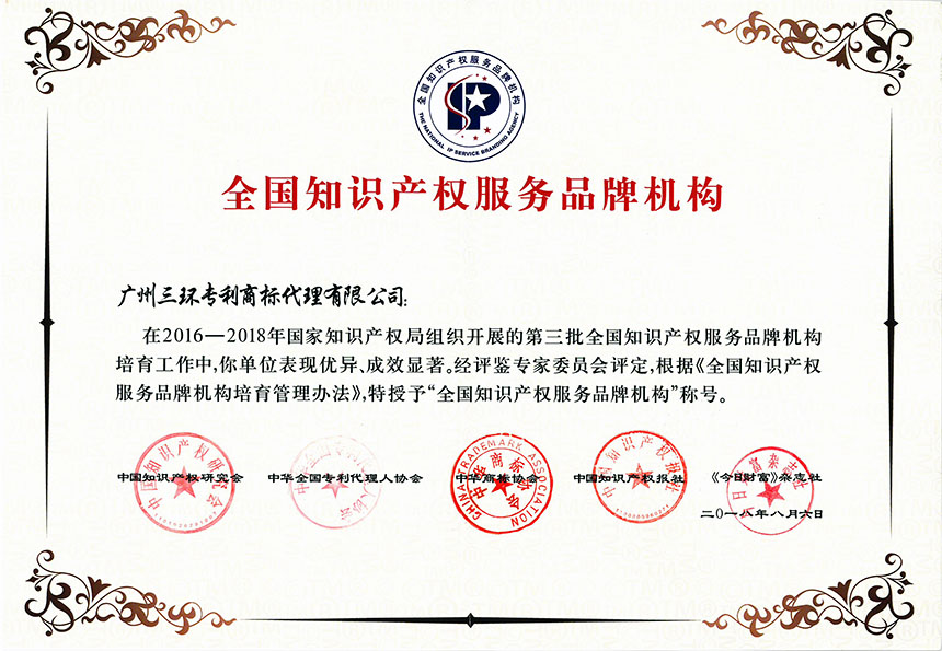 為樹立標(biāo)桿典型、發(fā)揮示范作用,國家知識產(chǎn)權(quán)局于2016年至2018年組織開展了第三批全國知識產(chǎn)權(quán)服務(wù)品牌機(jī)構(gòu)培育工作。在評鑒過程中,由政府部門、行業(yè)協(xié)會、媒體等各界人士組成專家委員會,從加強(qiáng)服務(wù)能力、創(chuàng)新服務(wù)模式、提升服務(wù)效益和打造服務(wù)品牌等方面,綜合考察培育機(jī)構(gòu)工作成效,并確定出“全國知識產(chǎn)權(quán)服務(wù)品牌機(jī)構(gòu)”的最終名單。三環(huán)不僅憑借強(qiáng)勁的實(shí)力入選培育名單,且在培育期間表現(xiàn)優(yōu)異,綜合實(shí)力顯著提升,順利通過重重考驗(yàn),榮獲了“全國知識產(chǎn)權(quán)服務(wù)品牌機(jī)構(gòu)”稱號。